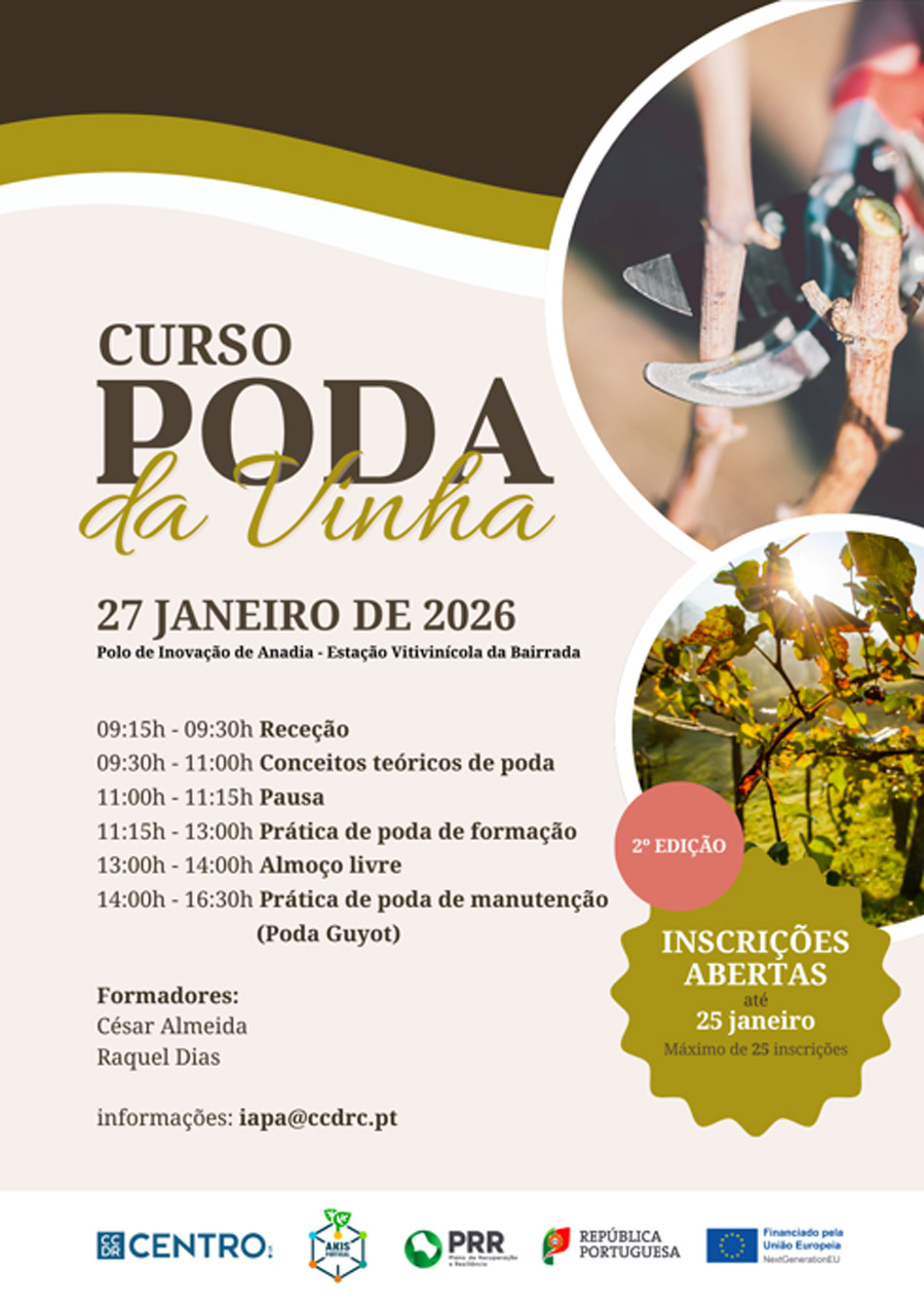 A Comissão de Coordenação e Desenvolvimento Regional do Centro, I.P. (CCDR Centro) promove, no dia 27 de janeiro, no Polo de Inovação de Anadia – Estação Vitivinícola da Bairrada, a segunda edição do curso “Iniciação à Poda da Vinha”.