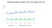 Segundo os Resultados Provisórios dos Censos 2021, residem no Centro 2.227.567 pessoas, das quais 1.060.784 são homens (47,6%) e 1.166.784 mulheres (52,4%). Na última década, a região registou uma diminuição na população de 4,3%, que foi mais acentuada do que a média nacional (-2,1%). Atualmente, o efetivo populacional da região é idêntico ao da década de 70 e representa 21,5% do total nacional, o peso mais baixo das últimas décadas (em 1960, a região concentrava 27,4% do total nacional). Das sete regiões portuguesas, apenas o Algarve (3,7%) e a Área Metropolitana de Lisboa (1,7%) registaram um crescimento da população.