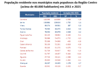 Os municípios mais populosos da região, com efetivos populacionais acima de 40.000 habitantes, são Coimbra, Leiria, Viseu, Torres Vedras, Aveiro, Figueira da Foz, Alcobaça, Ovar, Castelo Branco, Pombal, Caldas da Rainha, Covilhã, Águeda, Ourém, Alenquer e Guarda. Estes 16 municípios concentram 48,4% da população regional (valor que, em 2011, era de 47,1%). Os restantes 84 municípios da região reúnem apenas 51,6% da população regional. Considerando os municípios com mais de 20.000 habitantes, passaríamos a ter 35 municípios responsáveis por 72,5% da população do Centro (71,4%, em 2011).
