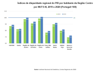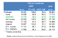 A coesão regional, avaliada pelas assimetrias regionais do PIB por habitante, aumentou face a 2019, uma vez que a diferença entre o maior e o menor valor do PIB por habitante observado nas sete regiões portuguesas diminuiu (em 2019, esta diferença era de 9.352 euros, tendo-se reduzido para 8.027 euros, em 2020).