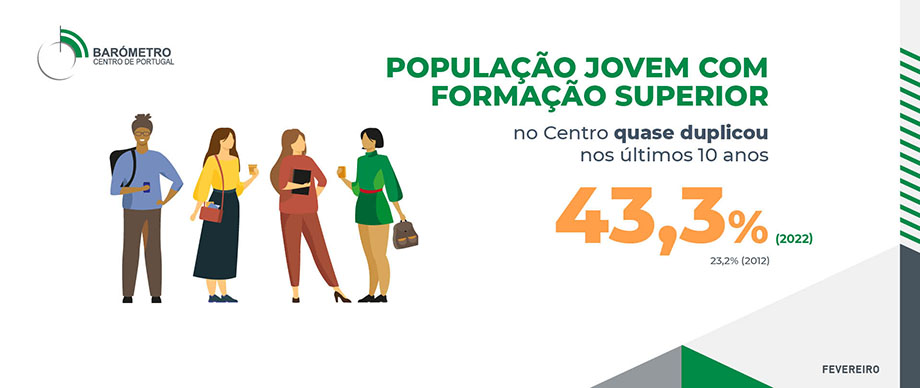 Em 2022, a população da região Centro, entre os 30 e os 34 anos, com o ensino superior completo foi de 43,3%, quase o dobro do valor de 2012, o que vem confirmar o claro reforço da qualificação dos jovens nos últimos anos. Já a população dos 25 aos 64 anos do Centro que participou em atividades de educação e formação atingiu um novo máximo de 14,6% em 2022.