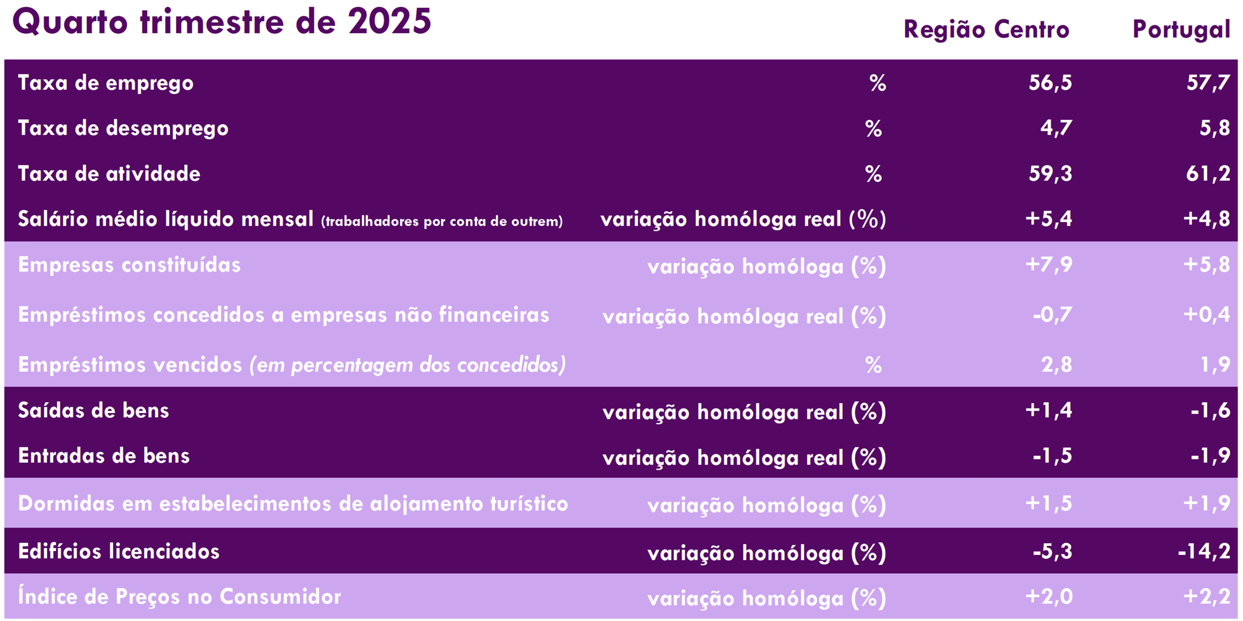 No quarto trimestre de 2025, a taxa de desemprego da região Centro diminuiu para os 4,7%, mantendo a trajetória decrescente verificada nos restantes trimestres de 2025 e situando-se abaixo da média nacional de 5,8%. Também os restantes indicadores do mercado de trabalho, as empresas constituídas, a atividade turística, o comércio internacional de bens, a maioria dos indicadores das obras concluídas e os créditos concedidos para habitação e consumo observaram variações homólogas favoráveis. Em contraste, as ações de insolvência de empresas e a maioria dos indicadores do licenciamento evoluíram desfavoravelmente neste trimestre. Já a inflação desacelerou face ao trimestre homólogo e ao trimestre anterior. Estas são algumas das conclusões do n.º 69 do “Centro de Portugal – Boletim Trimestral”, publicação que analisa a evolução conjuntural da região Centro.