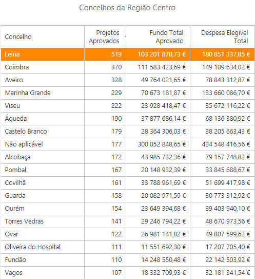 Os Concelhos Leiria (519) e Coimbra (370) são os que contabilizam mais projetos aprovados e também as duas maiores fatias de financiamento, 103 e 111 milhões de euros, respetivamente.