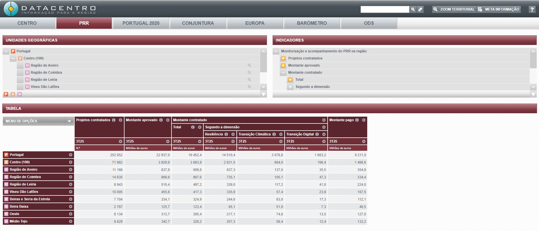 O novo domínio “PRR” disponibiliza 32 indicadores, que permitem acompanhar, trimestralmente, a evolução dos montantes aprovados, contratados e pagos pelo PRR em Portugal e na região Centro. A sua atualização regular constitui uma ferramenta essencial para compreender a evolução dos grandes números do PRR, com informação desagregada pelas três dimensões do PRR, Resiliência, Transição Climática e Transição Digital, respetivas componentes de investimento e pelas sub-regiões da região Centro.